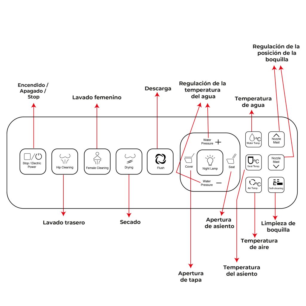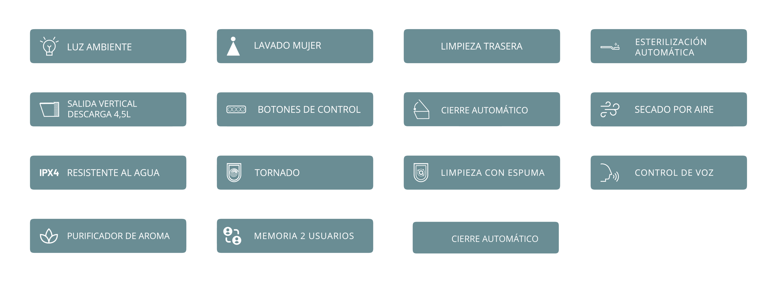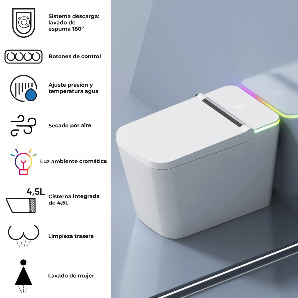 Destacada por su sistema de descarga 180º con espuma, que garantiza una limpieza eficaz y envolvente, apertura y cierre automático por sensor con radar de presencia y por control de voz con IA, lo que permite activar funciones sin contacto con el inodoro y depósito para aromaterapia, además de las funcionalidades de limpieza, secado y asiento calefactable que vienen incorporadas. Cuenta tambien con memoria de ajustes para 2 usuarios para permitir la personalización de sus funciones.