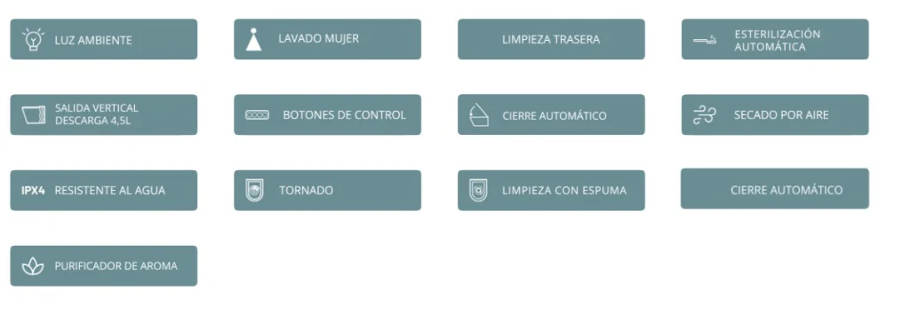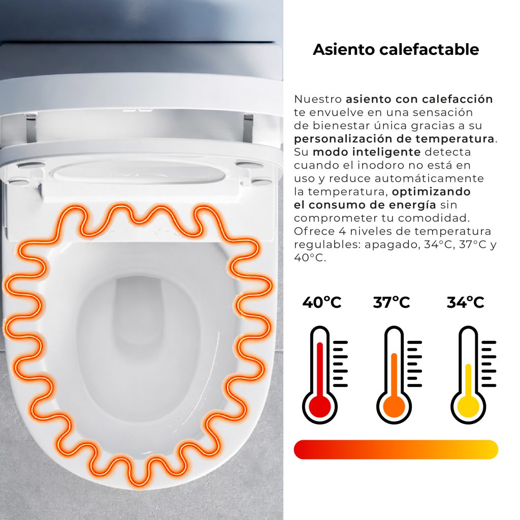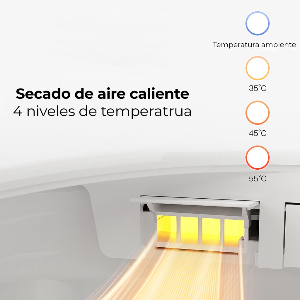 Integra lavado trasero y femenino, con ajuste de presión, temperatura y posición del chorro, además de función masaje para una higiene precisa y confortable. Dispone de secado con aire caliente regulable, asiento calefactable, apertura y cierre automáticos de asiento y tapa, luz de cortesía y descarga automática.